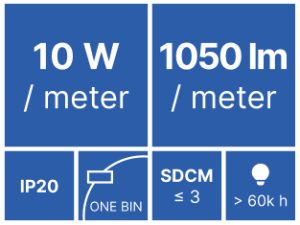 LED trak – Efficacy +  105lm/W  10W/m, 24 V, 1050 lm/m, IP20 blagovne znamke LEDSM vsebuje 140 SMD 2219 LED diod na meter. Širina traku je 8 mm. Uporablja se za bolj intenzivno osvetljevanje.